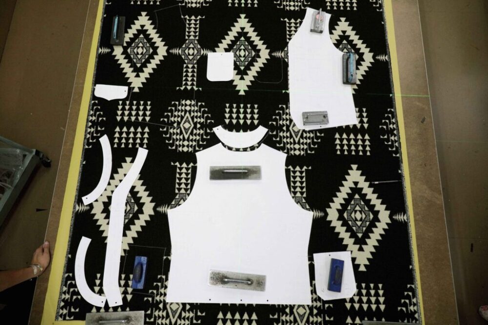 生地の上に型紙を配置していく。一見すると簡単そうに見えるものの、製品として仕上がった際にしっかりと柄合わせが成立するように型紙を置いていかねばならないので非常に難易度が高い。3次元の複雑な縫製イメージと2次元の裁断イメージを同時に頭の中で描きながら、柄合わせを考慮したパーツ取りを考えていく。