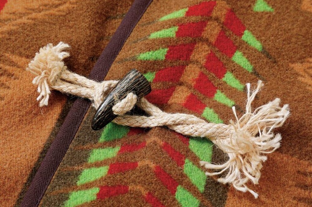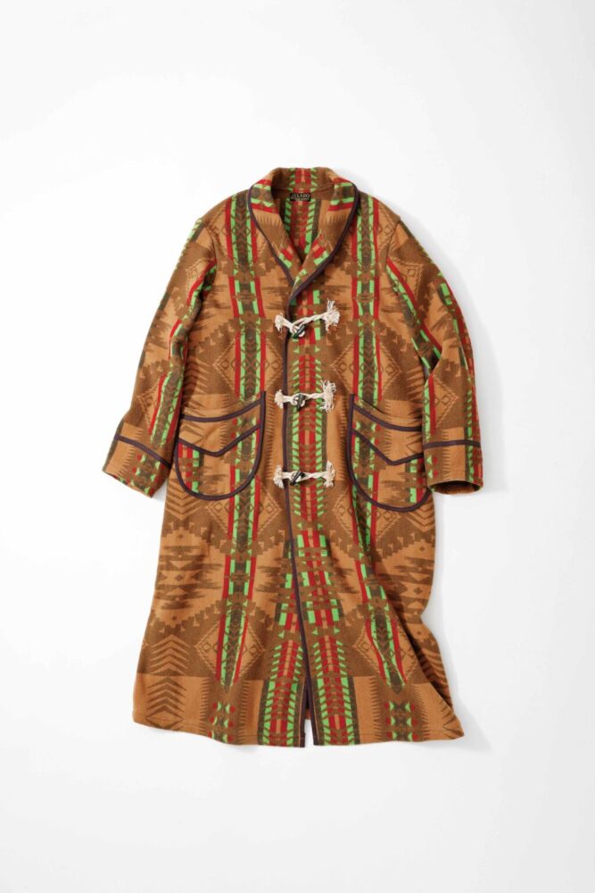 もしもネイティブアメリカンで実在したクロウ族がブランケットを売買していたら、という仮説のもとに作成した、ジャカード織機で織り上げたオリジナルの国産ブランケット生地を採用。1920 ~’30年代のブランケットガウンをベースにフロントボタンにアレンジを加えた。121,000円