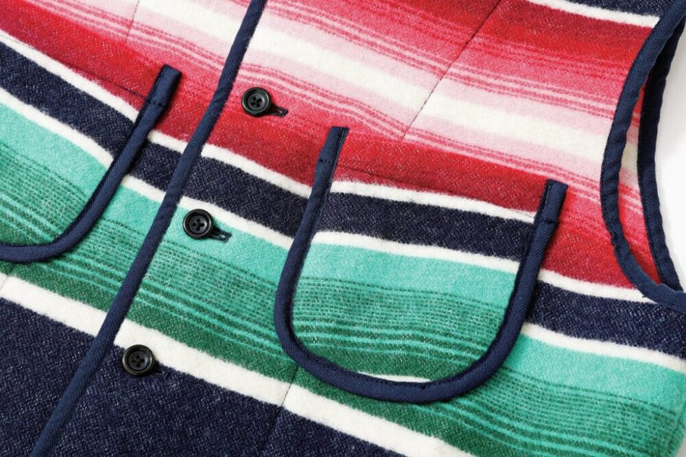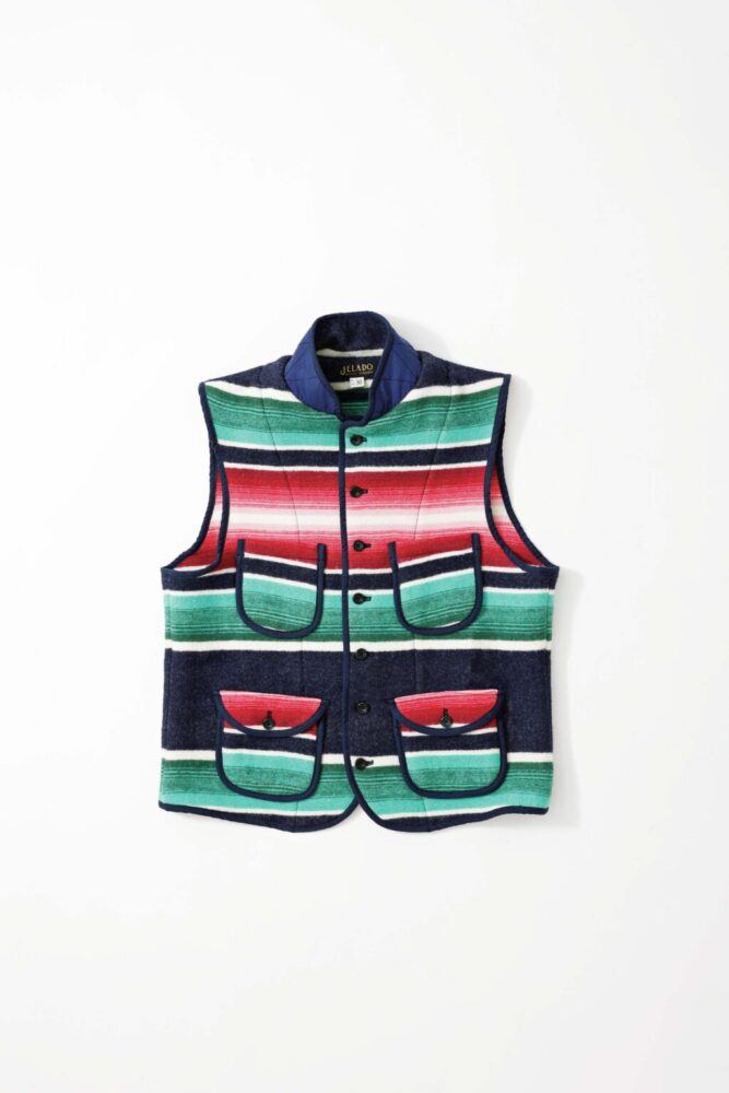 以前にコートを展開した別注のブランケットボーダーを使用したベスト。フロントの見返しやポケット周りのパイピング、水牛ボタンなどの装飾で、クラシカルかつ高級感のある佇まいに。生地は1940年代に作られていたブランケットの配色をアレンジして製作した。55,000円