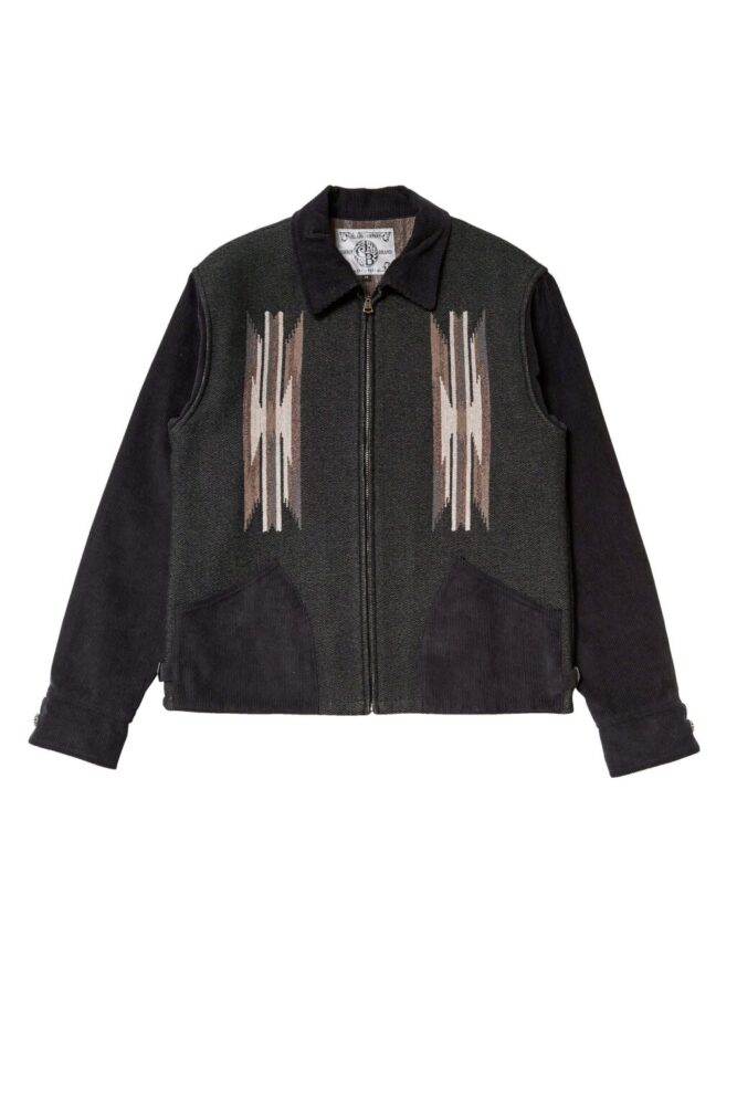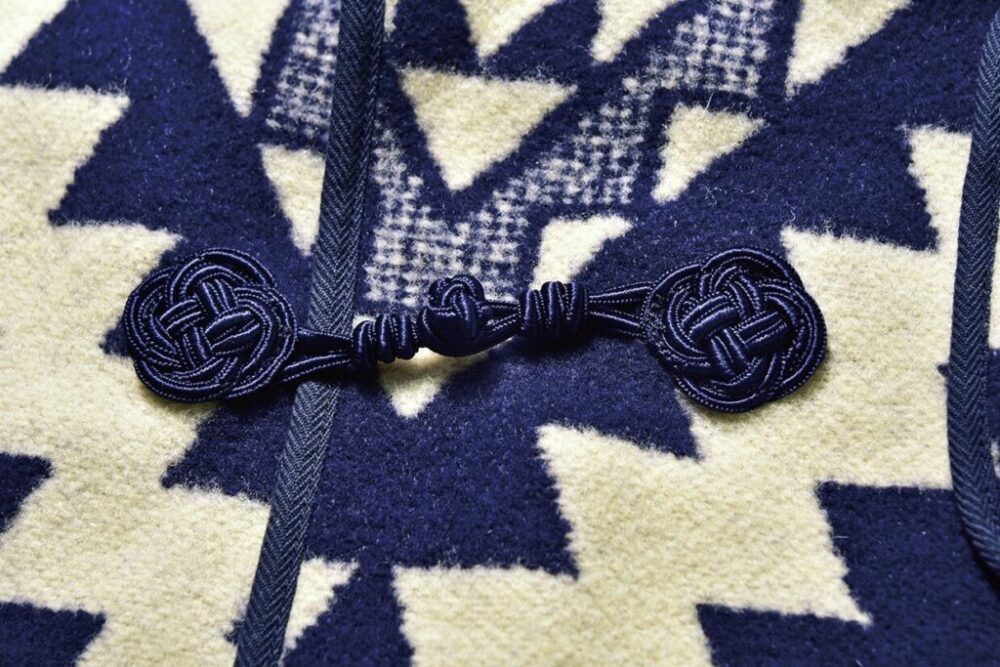 色数が多く複雑な柄を表現するために約2年試作を繰り返して完成したネイティブブランケット。ヴィンテージの雰囲気を再現したポケットの形状や、1930年代にあったA-1タイプのブルゾンをベースにした猫目シェルボタンなど、細部にまでこだわり抜いた1着。110,000円