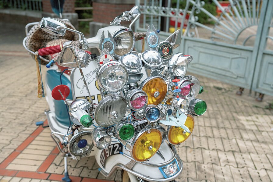 大量のライトをシンメトリーに配置したデコレーションがモッズの象徴と言えるフロントフェイス。イギリス製のフォグランプを中心に、自転車用ライトやアルパインホーンを装着。長いステーのミラーはネオモッズの特徴だ。
