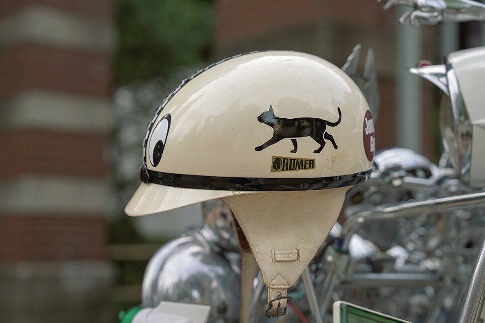 ドイツ製’60s Rumerヘルメット。ベルトのデザインや珍しいシルエットが気に入っているのだとか。