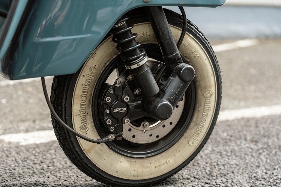 SIPキャリパー、YSSサスペンションで足周りをアップデート。ホワイトウォールのタイヤは’50sカーのデザインを意識したパーツチョイスなのだとか。