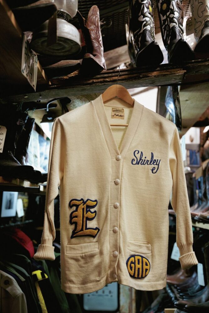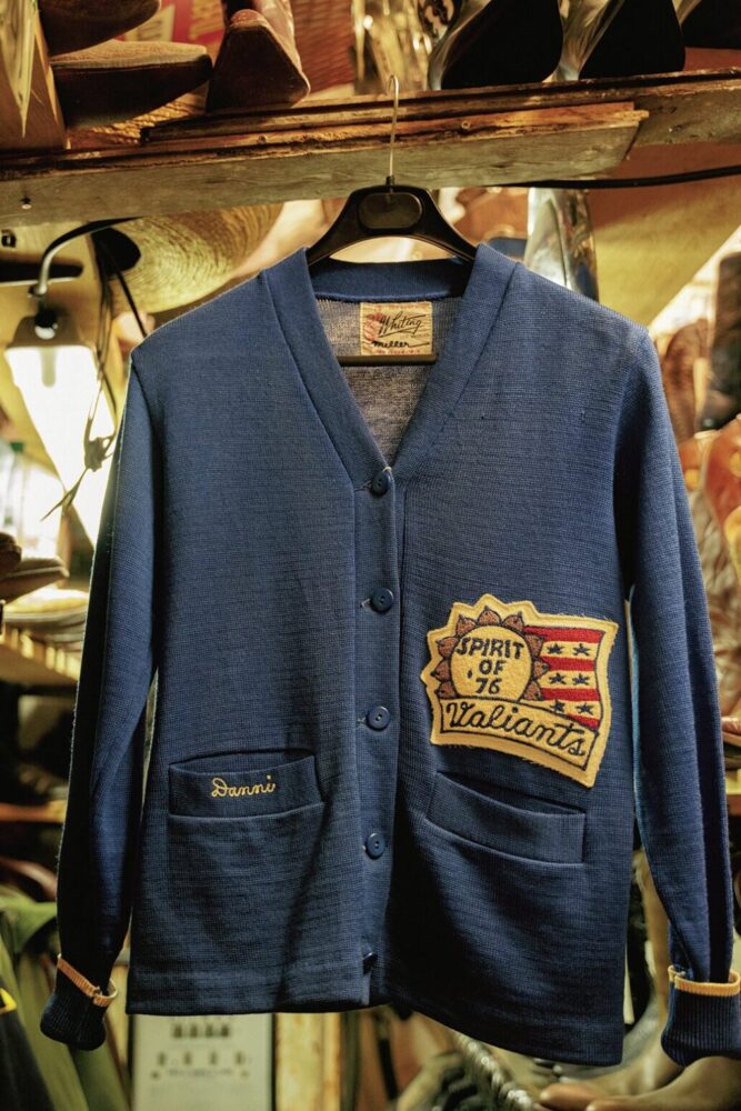 アメリカのハイスクールやカレッジもののストックが多いのもコチラの特徴。ウールのカーディガンはレディス合わせ。大型フェルトパッチには’76