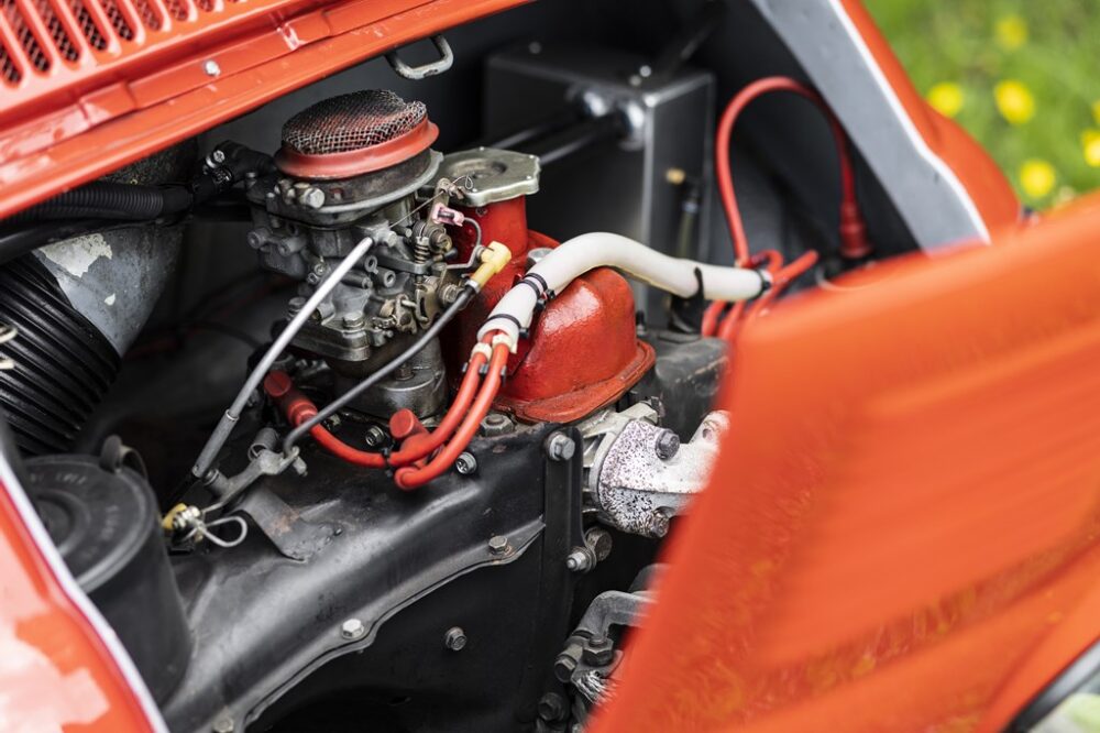 リアエンジン、リア駆動の一般的にRRと呼ばれる駆動方式。479cc、15psの空冷直列2気筒OHVエンジンが縦型に収納される。