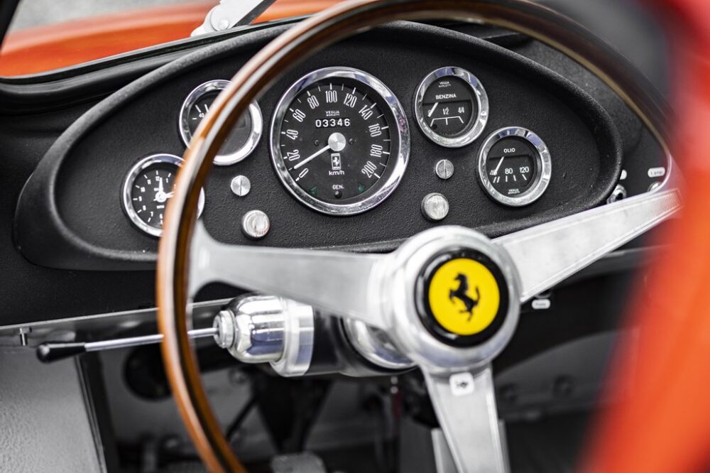 ハンドル、メーターにも「FERRARI」のエンブレムが覗くコックピット内。バケットシートが2席のみの車内は、無駄なデザインが、一切排除されている。