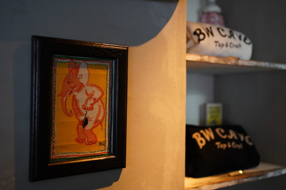 店内には多くのアートワークやアンティークの小物などがセンス良く置かれる。これらはすべてデザイナーのL.さんによるプロデュースで、アツシさんとコンセプトワークのミーティングを重ねながら導き出した空間。欧米の酒場カルチャーを熟知しているからこそ生み出せる雰囲気は唯一無二の世界観を創り出している。