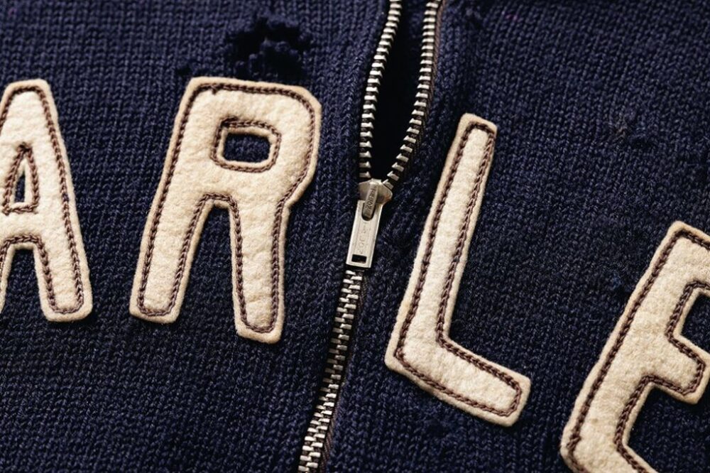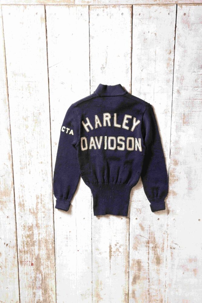 1930年代に作られたタロン社製ファスナーを装備したハーフジップデザイン。フロントバックともに「HARLEY DAVIDSON」のハンドメイドワッペンが付けられている。