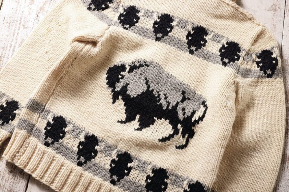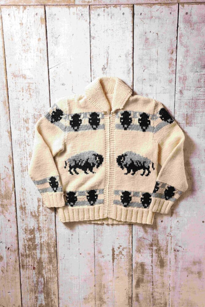「動物に限らず、乗り物やスポーツなど、いろんなモチーフを見かけるカウチンニットですが、バイソン柄はこれまで、いろんなデザインのニットを目にしてきた中でも特に珍しい1着です。向かい合ったバイソンに上下にはバイソンのトロフィーが肩と腰周りを一周するようにデザインされており、強烈なインパクトを放っています。これはJELADOでも作りたい! と思わせてくれた個人的にイチオシのカウチンニットです」