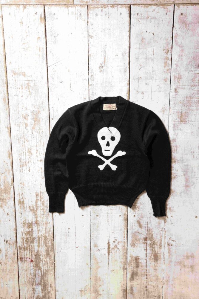 「もともと1940年代〜1950年代に作られたプレーンのVネックセーターにスカルのフェルトをセルフカスタムしたものです。スカルマークは1910年代頃、イギリスで実在したフットボールチームのユニフォームのセーターから再現しました。気に入っているので黒ベースのニットの他にも白バージョンやTシャツにも付けています。冬でもオートバイに乗るのでライダースジャケットのインナーに防寒具として必需品となっています」