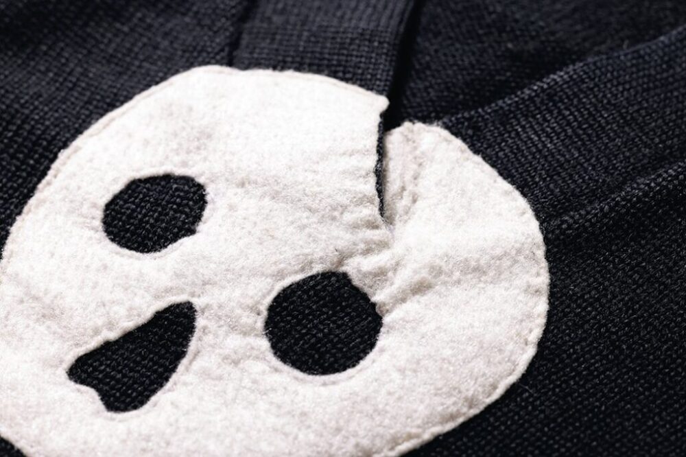 ベースのニットはVネックの無地ニット。タグもしっかり残されコンディションも良好。スカルのフェルトカスタムは澤田氏自身がカスタムし、他にも同じカスタムを施している。