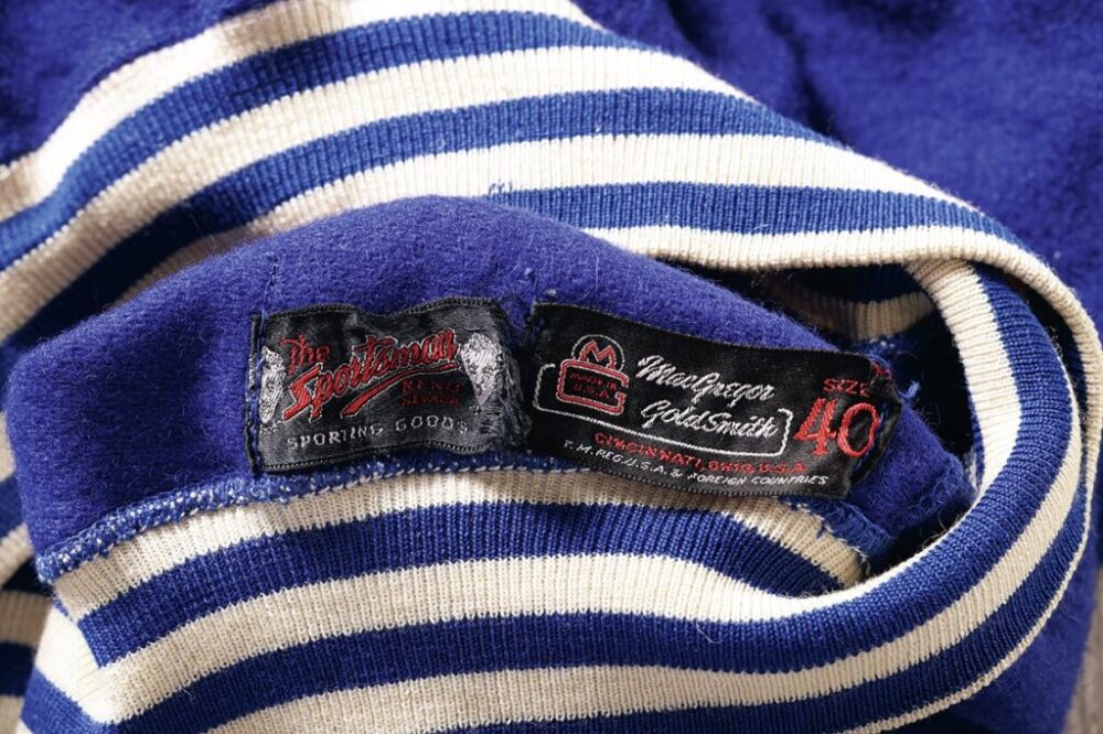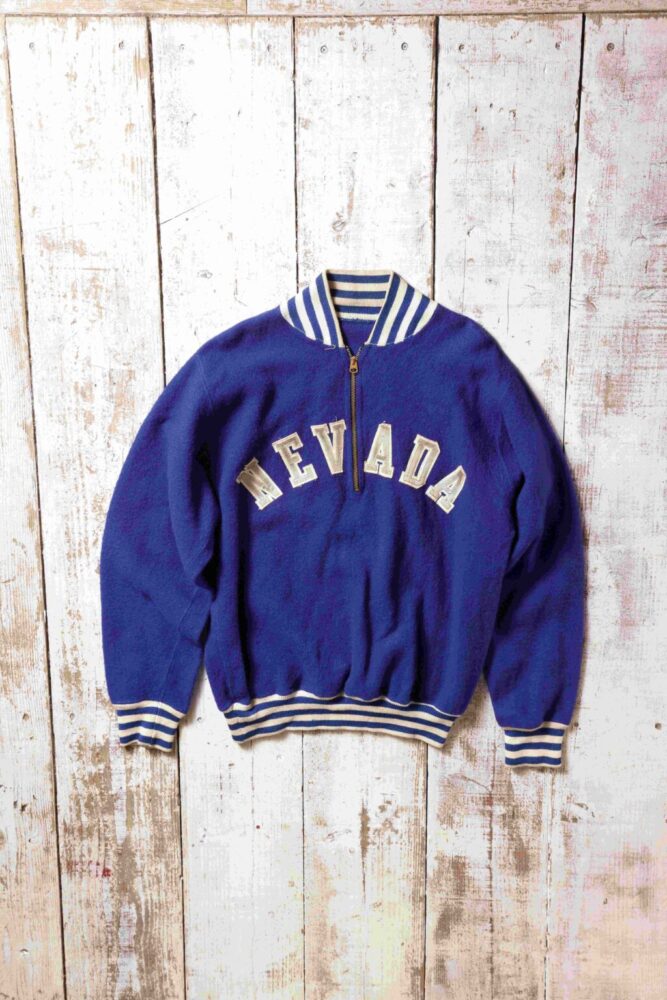 「カリフォルニア州パサデナで開催されたヴィンテージイベントに参加した時、すぐ目の前のブースで売っていた1950年代のUniversity of Nevadaのアスレチックウエアだ。一見すると、ハーフジップのコットンスウェットのようだが、これは縮絨ウール。当時のカレッジものではこの縮絨ウール素材は防寒性が高く、洗濯も容易だったので多く使われた。ニットか? というと否。でも、ウールということでご勘弁いただきたい」