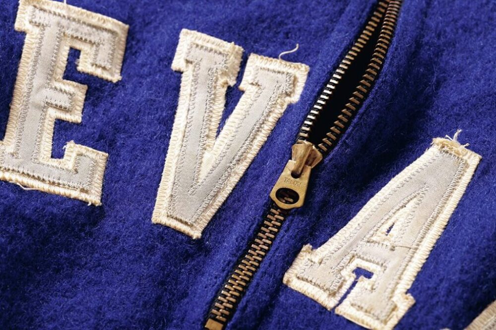 1950年代らしいブラスのタロンジッパーがヴィンテージならではのディテール。University of Nevadaのスクールカラーであるロイヤルブルーが美しく、時代感がある。