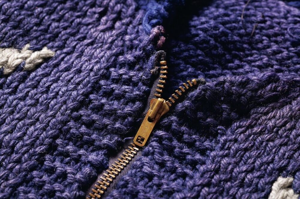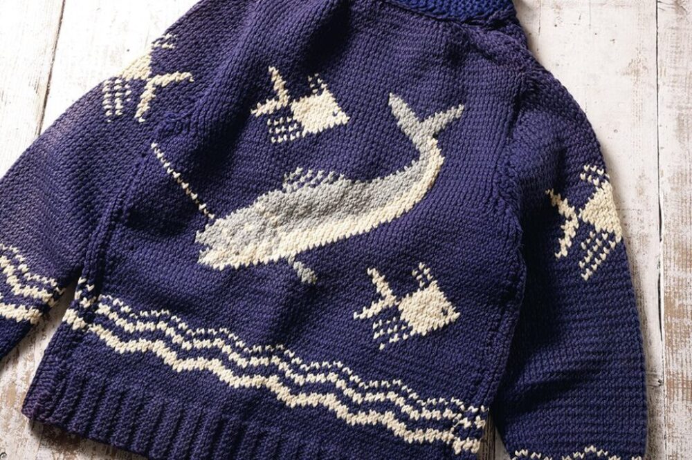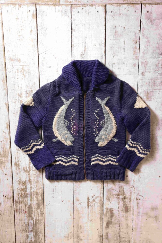 「カウチンセーターを集め始めて40年。いまだに良い柄が見つかれば買っています。とくに1950年代の『突飛なデザインでの流行』による配色の多さやモチーフの面白さは魅力。このネイビーは就職して2年目くらいに糸のゴツさや、カウチンなのに魚モチーフという面白さに惹かれて購入しました。見知らぬ通りすがりのおばちゃんに褒められた事や反社に絡まれて穴が空いたりしましたが、修理しながらずっと着ているお気に入りです」