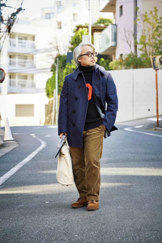 タートルネックセーターはBuzz Rickson’sのものでヘビーに編まれたミリタリーセーター。同じく肉厚なウールメルトンのピーコートで冬対策も万全だ。
