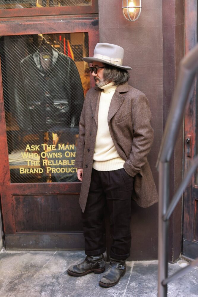 清潔感のあるオフホワイトのタートルネックセーターを主役にツイードのチェスターコートを着用。綺麗にまとまり過ぎないよう履き込まれたエンジニアブーツで武骨さを演出している。