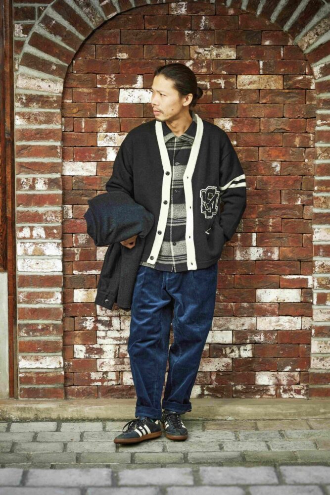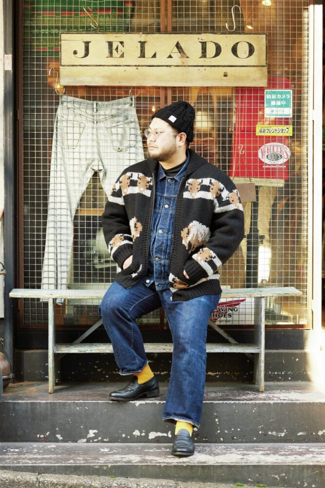デニムセットアップにヴィンテージ市場では希少なバイソン柄のカウチンセーターを着用。足元にレザーシューズを合わせることでキレイめなバランスを意識。