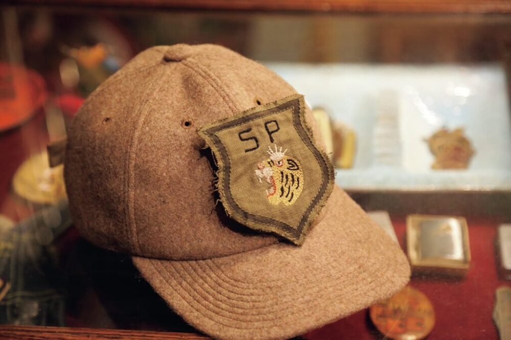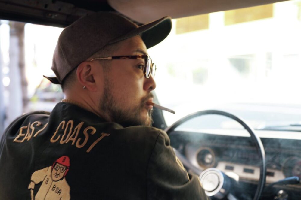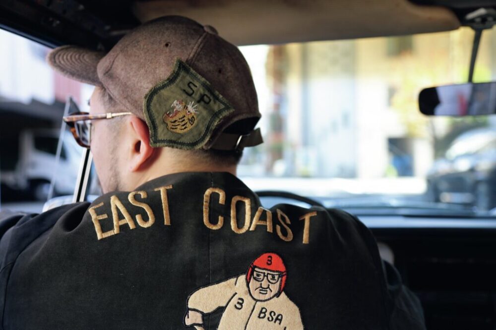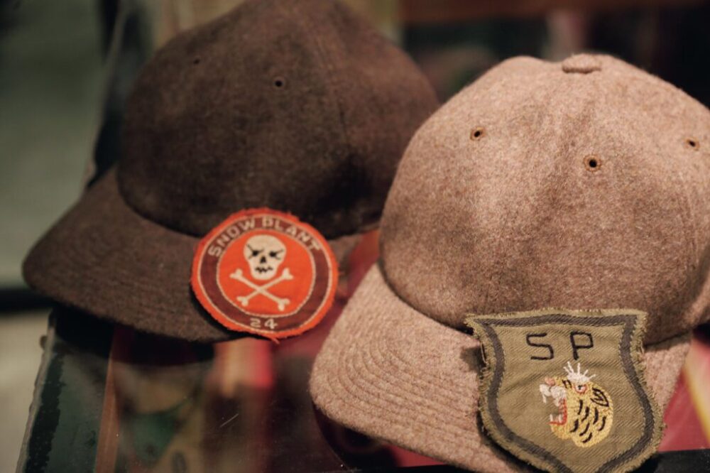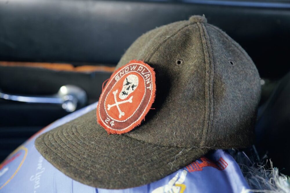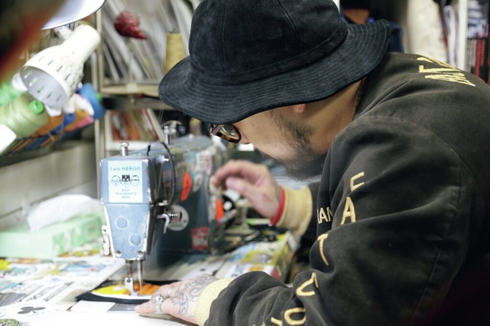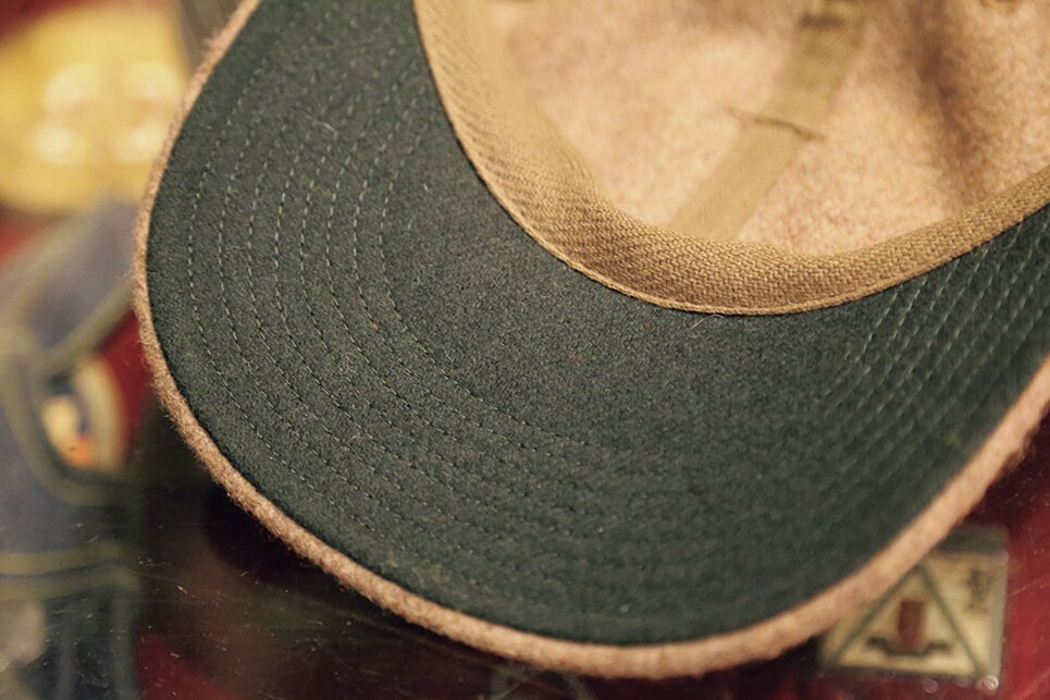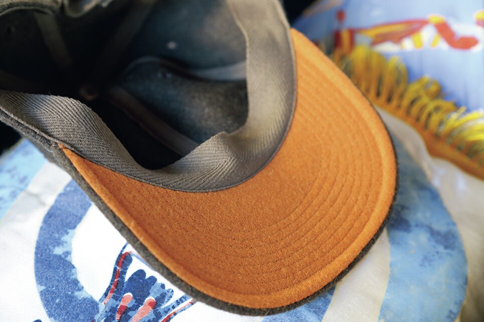 サンプルのウールキャップを試着するデザイナーの堀川氏。ピンバックのパッチは、好きな位置に取り付けられるのが魅力。本人は左後ろに付け、他とは一線を画すスタイルを披露してくれた。その日の気分に合わせて様々な表情を楽しめるところが、NORTH NO NAMEの遊び心!