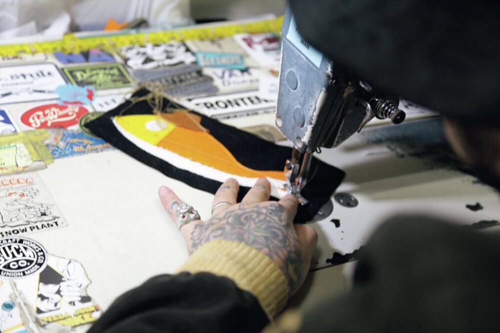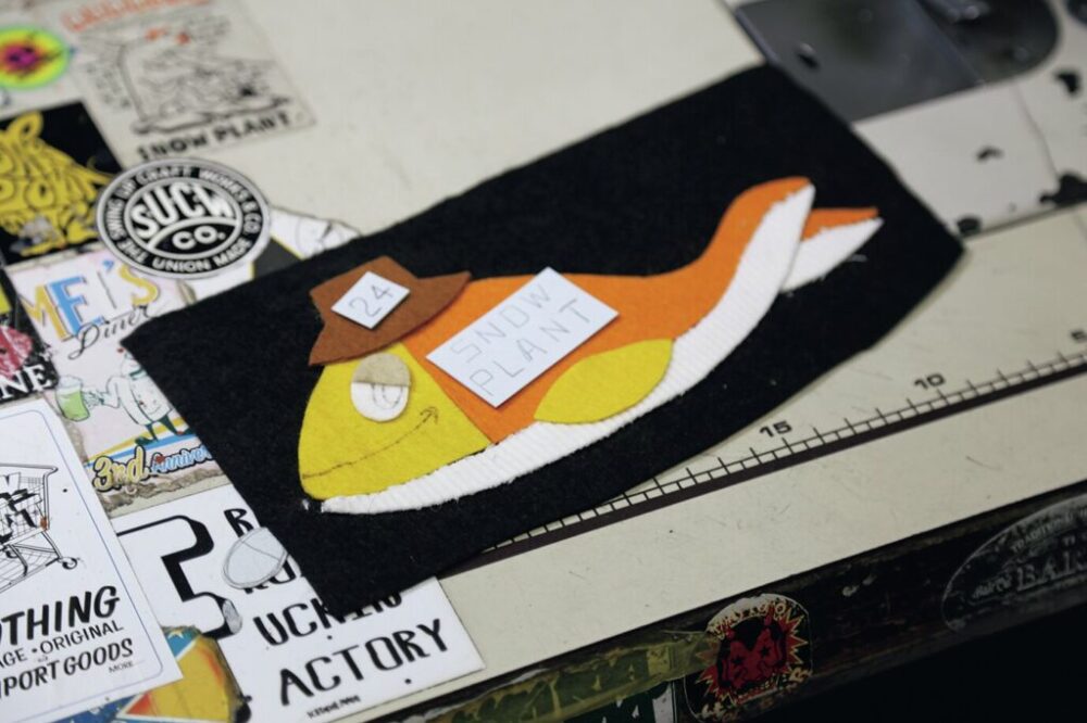 鯨をテーマにしたフェルトワッペン。スケッチ画をもとに試作段階だが、ポップな配色のボディに文字が刺繍される予定。このLIMITED PATCHESシリーズは、1月6日(土)〜8日(月)の3日間限定で受注販売する。他に大きなサイズのBIG PATCHも発売予定。
