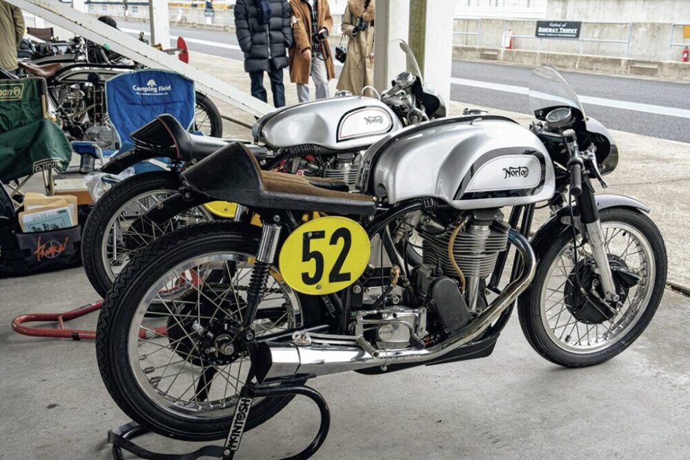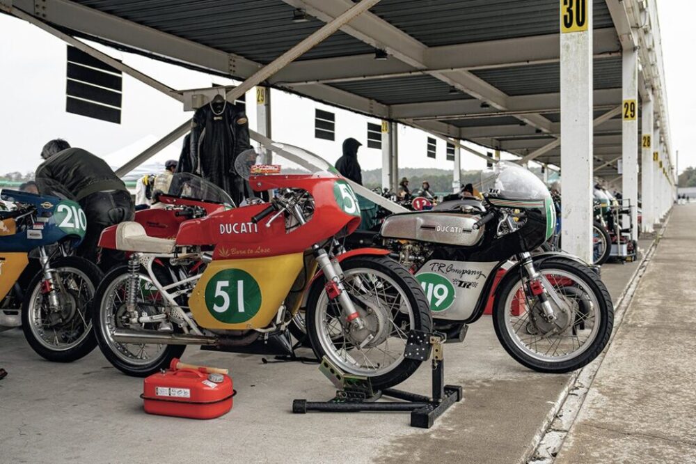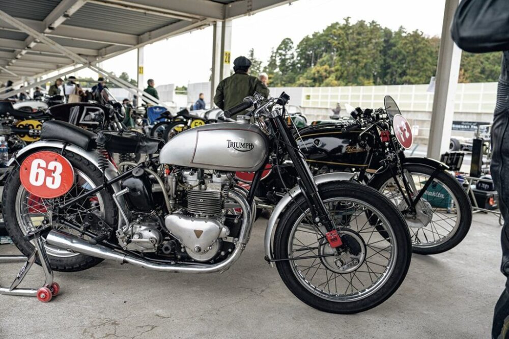 写真はTRIDEがリビルドしたTriumphの工場レーサーT100GP。NortonフレームにTriumphエンジンを搭載するTritonは伝統的な手法だが、OLD FUNが手がける上の車両はGPエンジンを搭載するスペシャル。歴史的な名車の走りを見るだけでも貴重な経験だ。