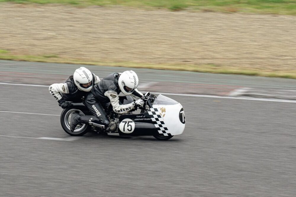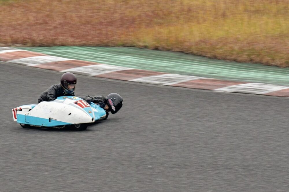 サイドカー付きの3輪クラスのレース。パッセンジャーは当然乗っているだけではなく、ライダーの運転に合わせて重心を傾ける高度な技術が必要。ライダー&パッセンジャーの阿吽の呼吸が見所だ。