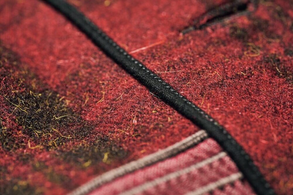ボディは先染めのウール100%素材。身返しなどには黒いパイピング処理も施した丁寧な作りが特徴。