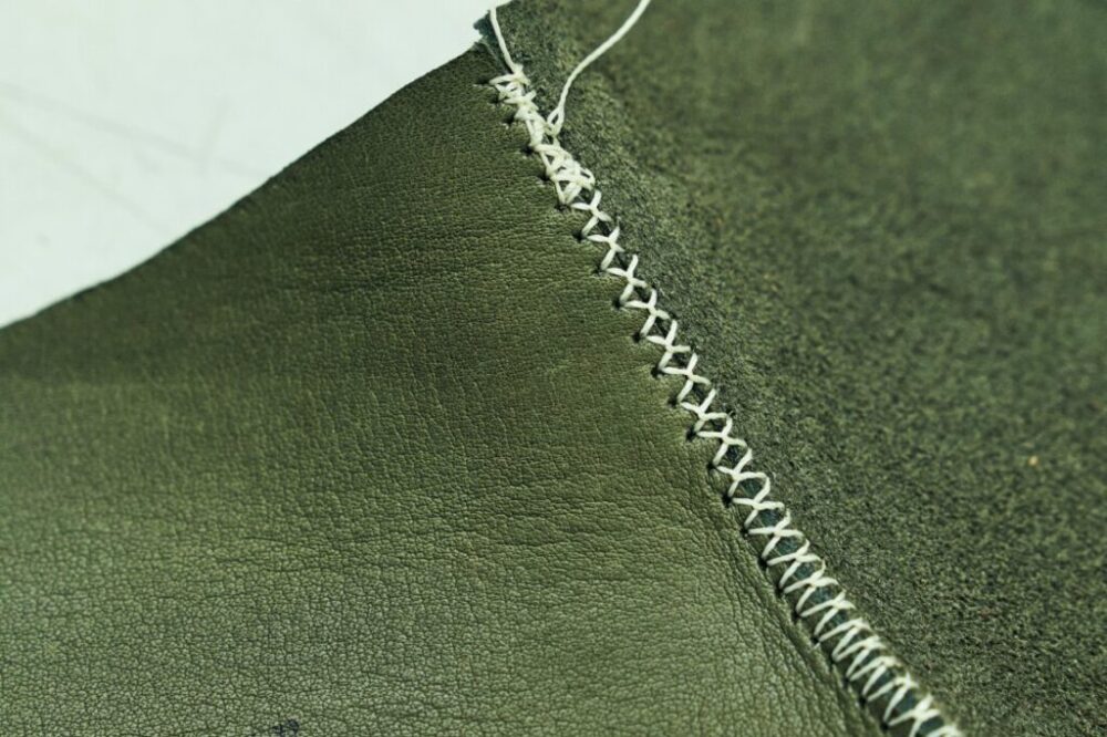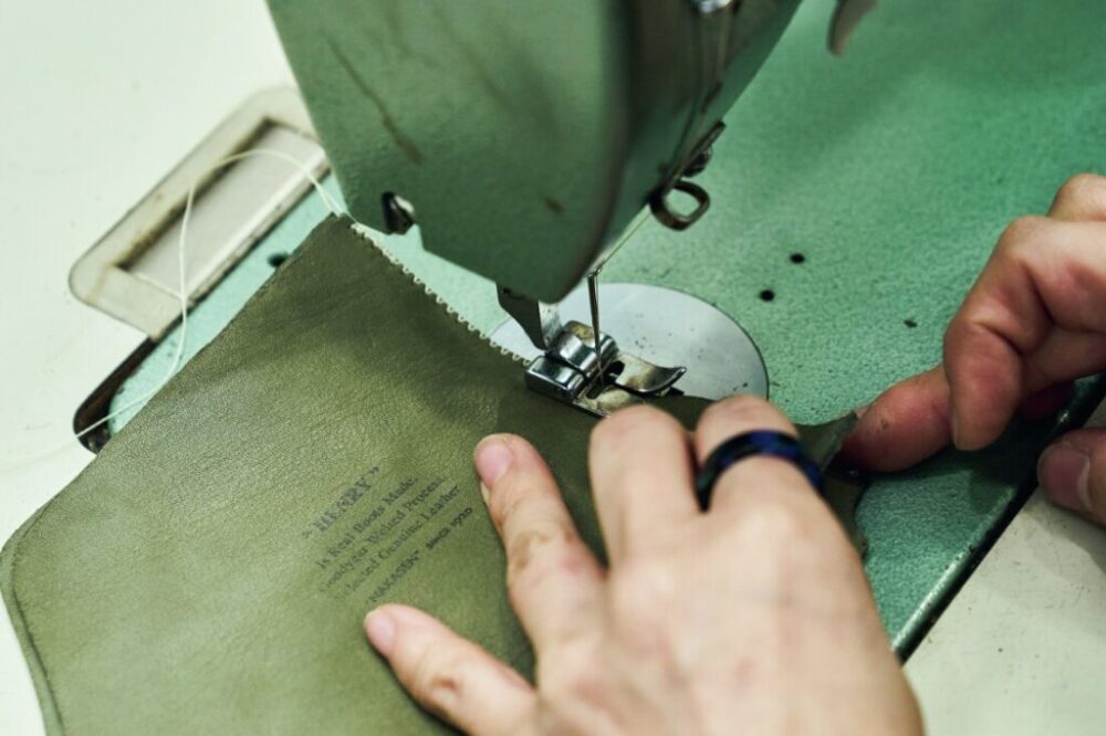 タンニンを多く含んだコシのあるバケッタレザーをポストミシンで縫製していく。モデルによって差異はあるが、基本的に3㎝に12針というピッチで縫っていく。