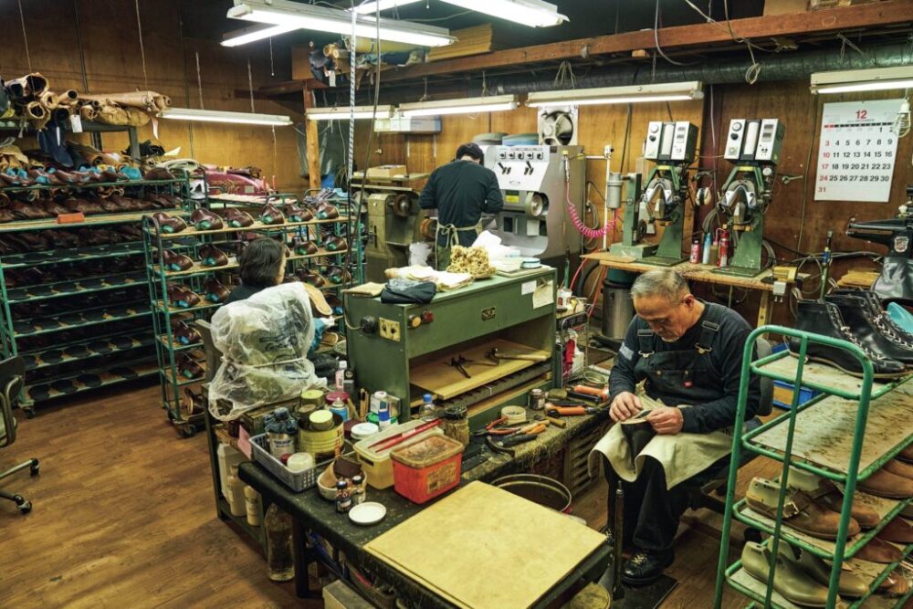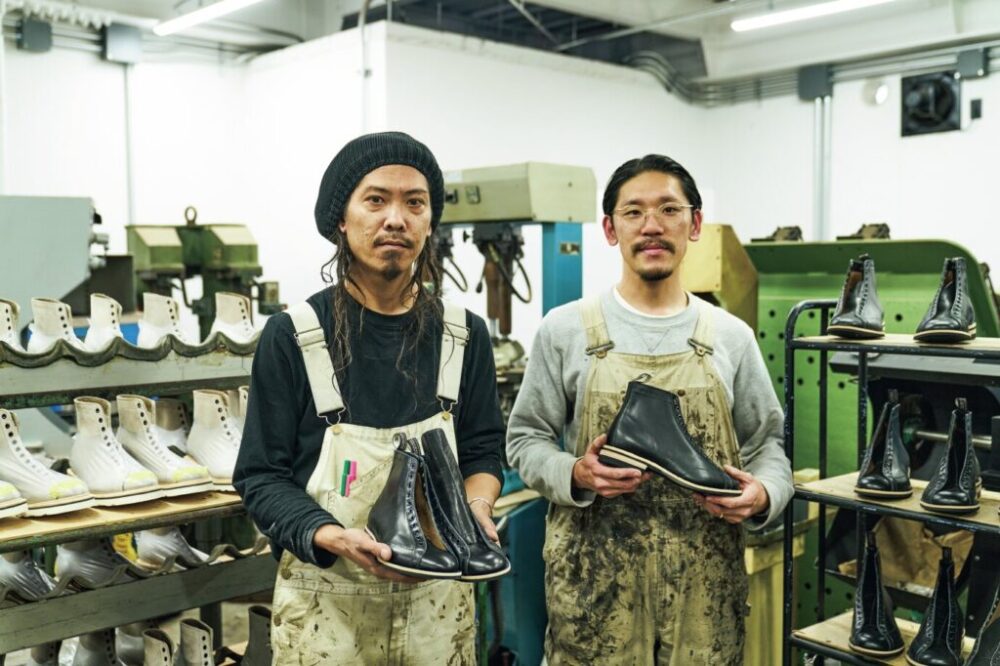 BROTHER BRIDGEの自社ファクトリーで働く精鋭の職人、志田さん(右)と山本さん(左)。彼らの生み出す靴は、ワイルドさと上品さが同居した唯一無二存在感を放っている。