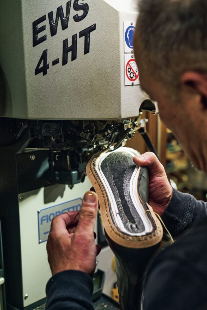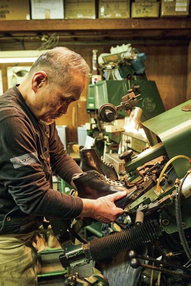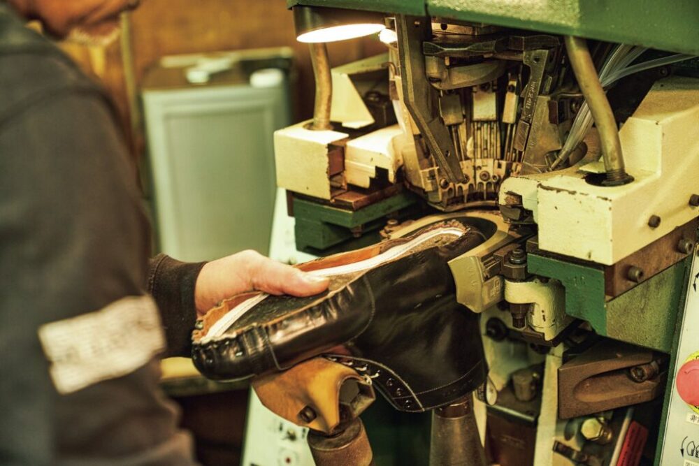 「ジュピター」と言われるアウトステッチャーマシンで出し縫いを行う。かなり力のいる作業だ。これでアウトソールが装着される。