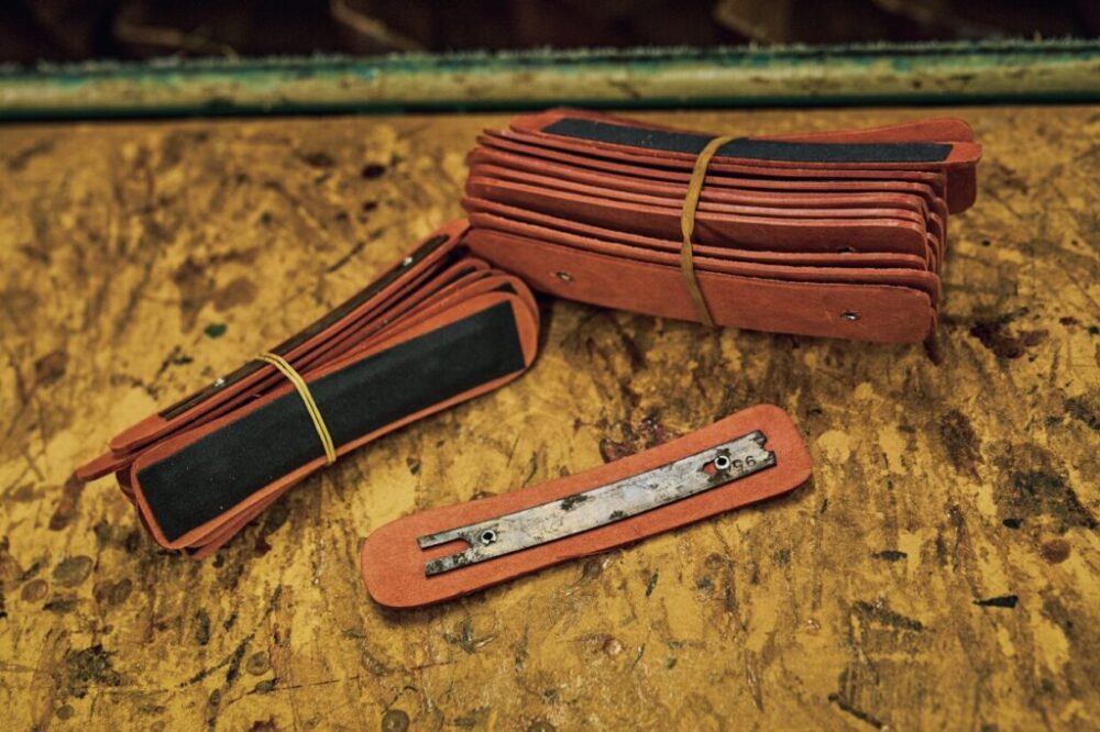 こちらがHENRYで使用されるパーツの抜き型。革の繊維の方向を読みながら、パーツを抜いていく。BROTHER BRIDGEの靴作りは、ここから始まるのだ。