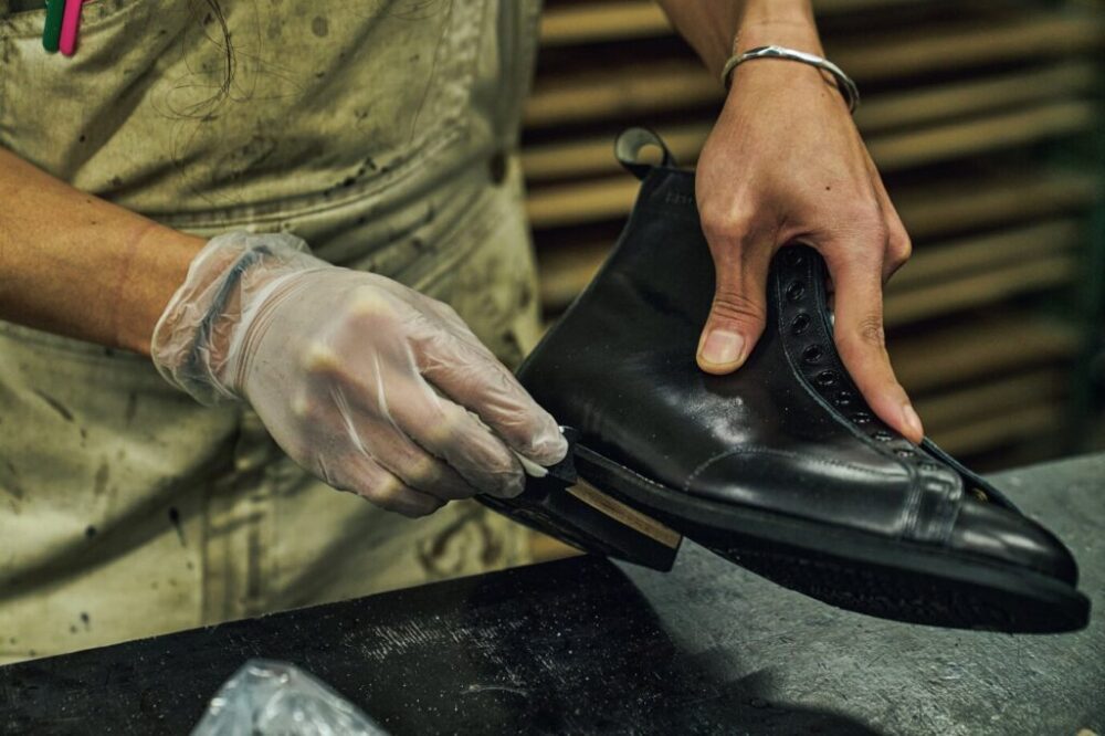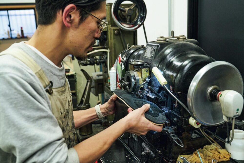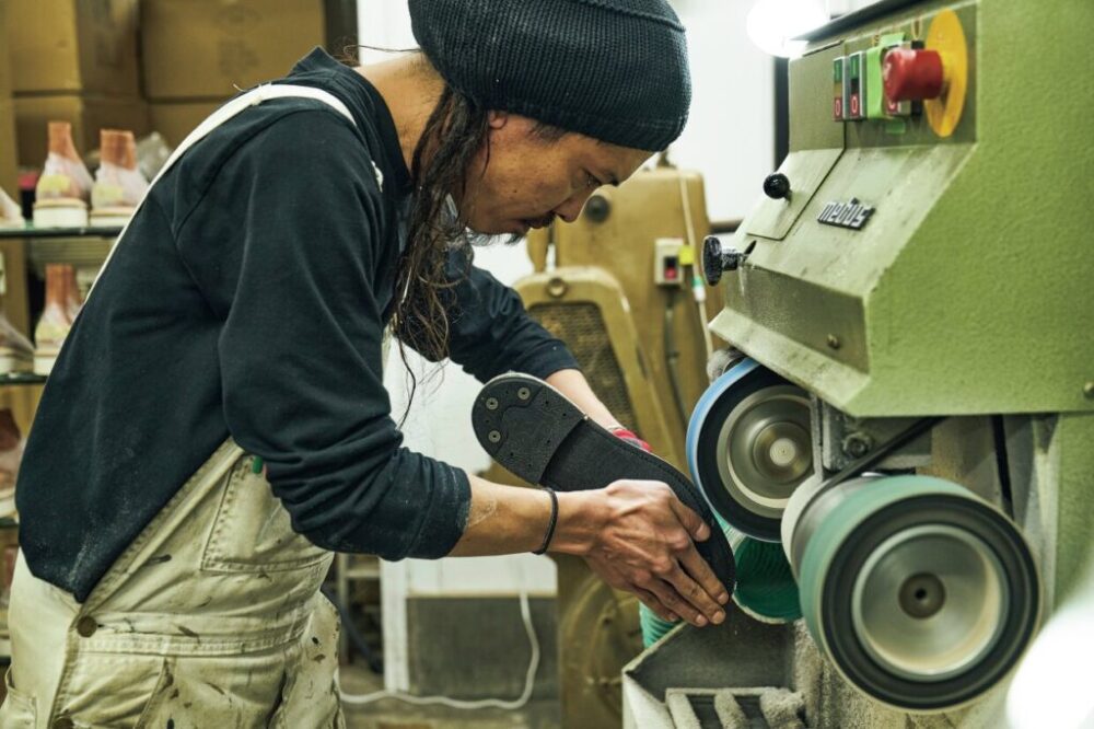 サンドブラストでソール部分を綺麗に削り、なめらかにしていく。こうした細やかな作業の積み重ねが、靴の「美しさ」となって現れるのだ。