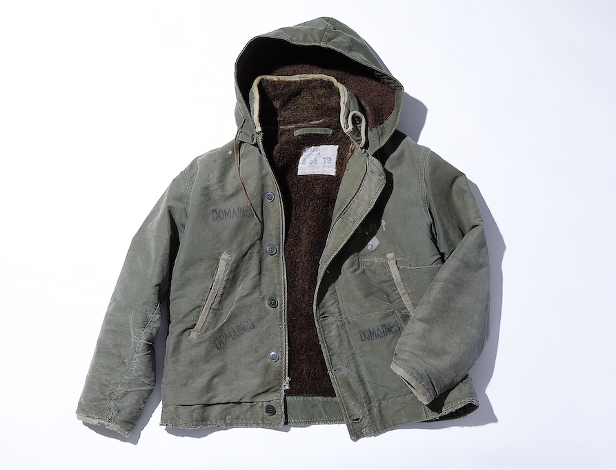 パッと見、米軍のデッキジャケットの民生品のように見えるけど、こえはフランス海軍(Marine Nationals)のデッキジャケット。当時米軍と仏軍は友好国で、ミリタリーウエアにも共通項が多い。デザインは米軍のデッキジャケットにフードを付けただけだが、かつて着られていたモノなので、生地の褪色やリペア跡も秀逸。実物を初めて見てサイズも良かったので購入した。