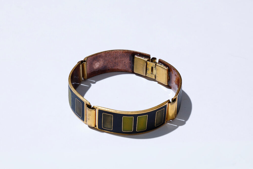ベルリンに行ったときに見つけてたまたま入ったアンティークのアクセサリーショップである RHEINFRANKで見つけたブレスレットは、真鍮プレートに七宝でデザインされたパネルで構成された 1950年代のジャーマンアンティークだということ。色と雰囲気が良く、その芸術性の高さにも惹かれて購入。高価な宝石を使ったり、主張のある造形とかではなく、こういったシンプルな佇まいでも、しっかりと主張する作りの良さやデザイン。これこそおしゃれなモノなのではないかと思っている。