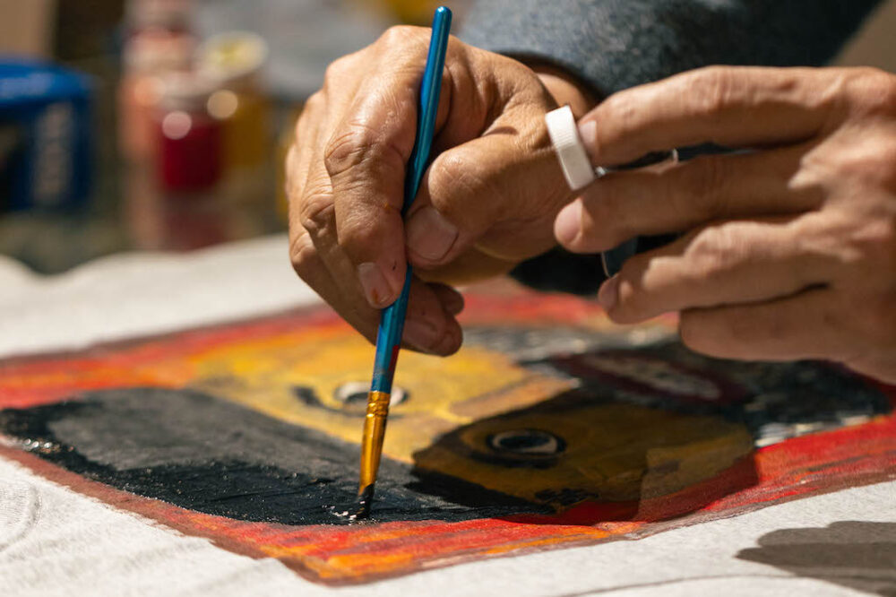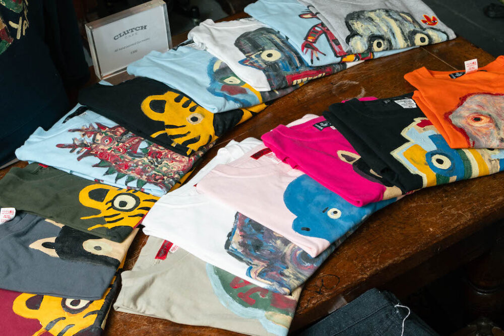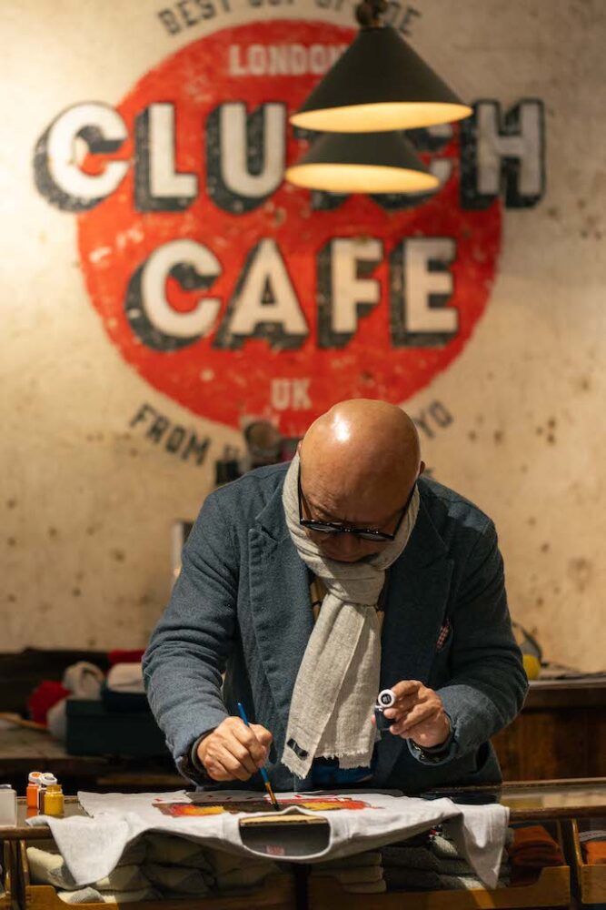 今回のイベントでは、山根さんをお招きし、Yamane Japanese Denimsのアイテムにご本人がその場で直筆ペイントをしてくれるというもの。今回はデニムだけではなく、T-shirtにシャツに、と筆を走らせておりました。