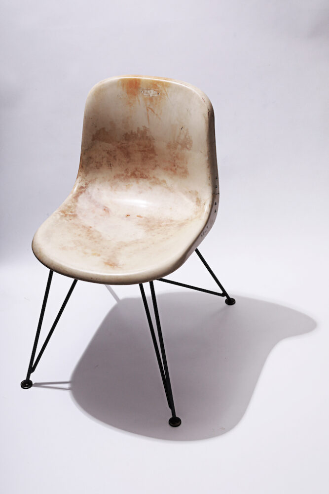昭和時代の野球場で使われていた観客席をスツールへとリメイクした1脚。これは神戸に出張に行ったときに地元でふらった立ち寄った骨董品店で出会ったモノ。 全体のデザインというよりは、年代や、経年によって生まれた座面の色ツヤ感やヤレ感などに惹かれてしまうのはいつものこと。やはり気になって購入してしまった。現在も事務所で活躍してる。