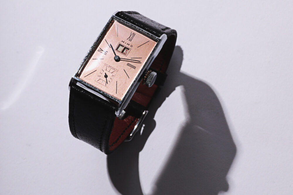 ヨーロッパのアンティークウォッチである。これはデイト付きの時計としては最初期のモデルで、通称「ビッグ・デイト」と呼ばれているMIMOの1930年代のモデル。サーモンピンクの文字盤やコンディションの良さに惹かれた。昔はピッグスキンのベルトが多かったので、そんな時代感に合わせてベルトも作ってもらっている。ちなみにMIMOは1950年代ごろまでGirard-Perregaux(ジラール・ペルゴ)の欧州市場向けブランドとして存在していた。手に入れたはいいけれど、普段はほとんど時計をしないので、コレクションのひとつになっている。