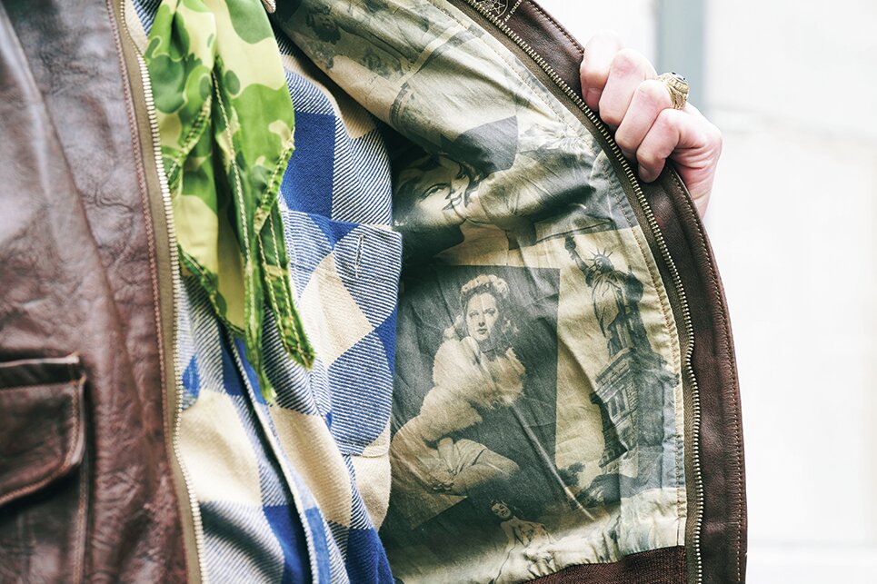ライニングにピンナップガールのプリント生地が張られたA-2。擦り切れるまで愛用し張り替えたというストーリー性が興味深い1着だ。