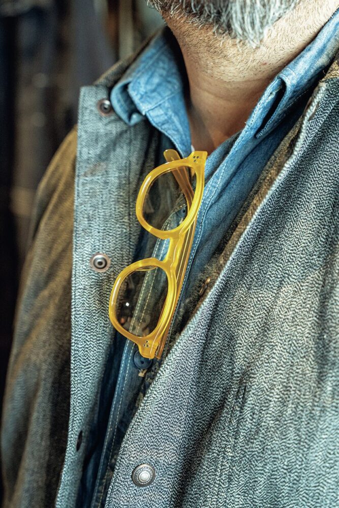 薄めのカラーレンズを入れたイエローフレームのアイウエアは金子眼鏡とのコラボもの。コーディネイトのアクセントとして有効だ。