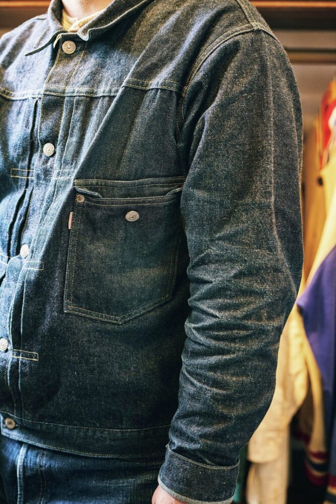 フロントポケットのフラップをインして着用するのが藤木さん流。スリーブ部分のヴィンテージ顔負けの色落ちはWAREHOUSEならでは。
