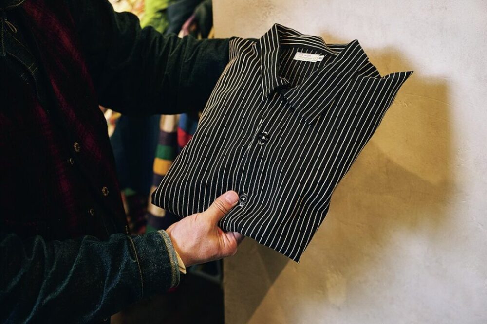 今季の新作であるシャツはドビー織でストライプを表現。1900年代前後のシャツをモチーフとしたアイテムで凹凸のある生地の質感が魅力。