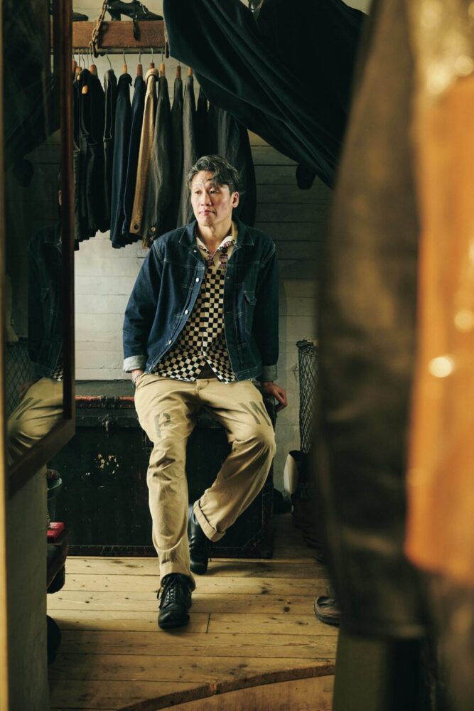 ヴィンテージ業界で話題のプリントコーデュロイシャツ。希少な個体を元に再構築した新作のチェス柄のコーデュロイシャツをインナーにチノトラウザーズとデニムジャケットで合わせた。シンプルながらもナチュラルで、ややラフに着こなすのが後藤氏のスタイルで、派手過ぎず、コスプレちっくに見えないこなれた大人のカジュアルスタイルは参考になるはず。