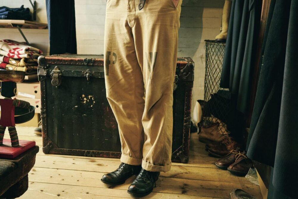 定番として作り続けてきたチノトラウザーズだが、新たにオリジナルレシピで生地から製作。前後にPWのステンシル入り。