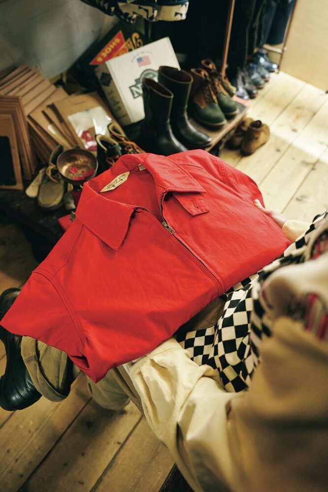 目の覚めるようなビビッドな赤のジャケットは今シーズンの新作。英国空軍発の高密度コットンで知られるベンタイルの生地を使用している。