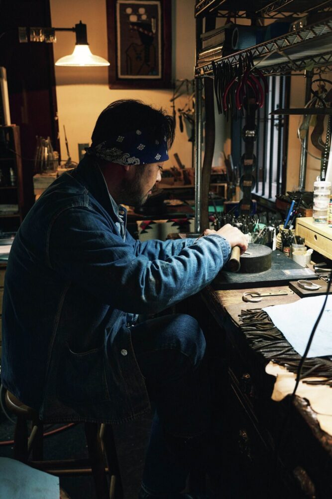 ハンドメイドによるシルバージュエリー、Larry Smithを手がける林田氏。工房に籠って黙々と銀板を打ち付ける姿は今も昔も変わらない。そんな彼が身につけるものはヴィンテージデニムを中心に流行り廃りのないシンプルなもの。とくに着用していてストレスのないライトオンスのデニムカバーオールは、作業の足枷にならないため、最近好んで着用している。