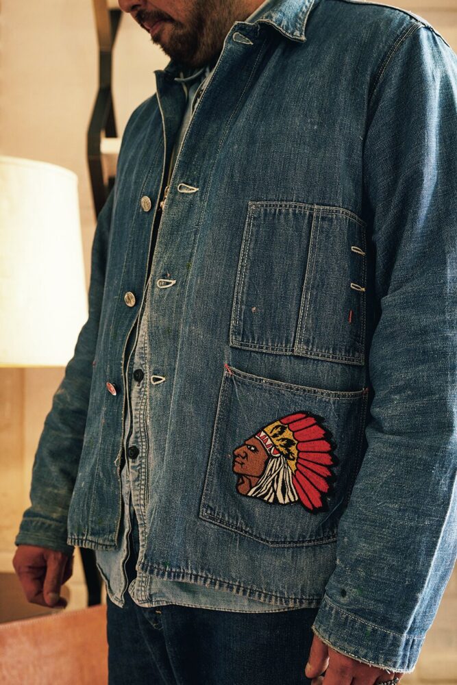 1940年代のデニムカバーオールにインディアンヘッドの刺繍ワッペンでセルフカスタムを施したお気に入りの1着。