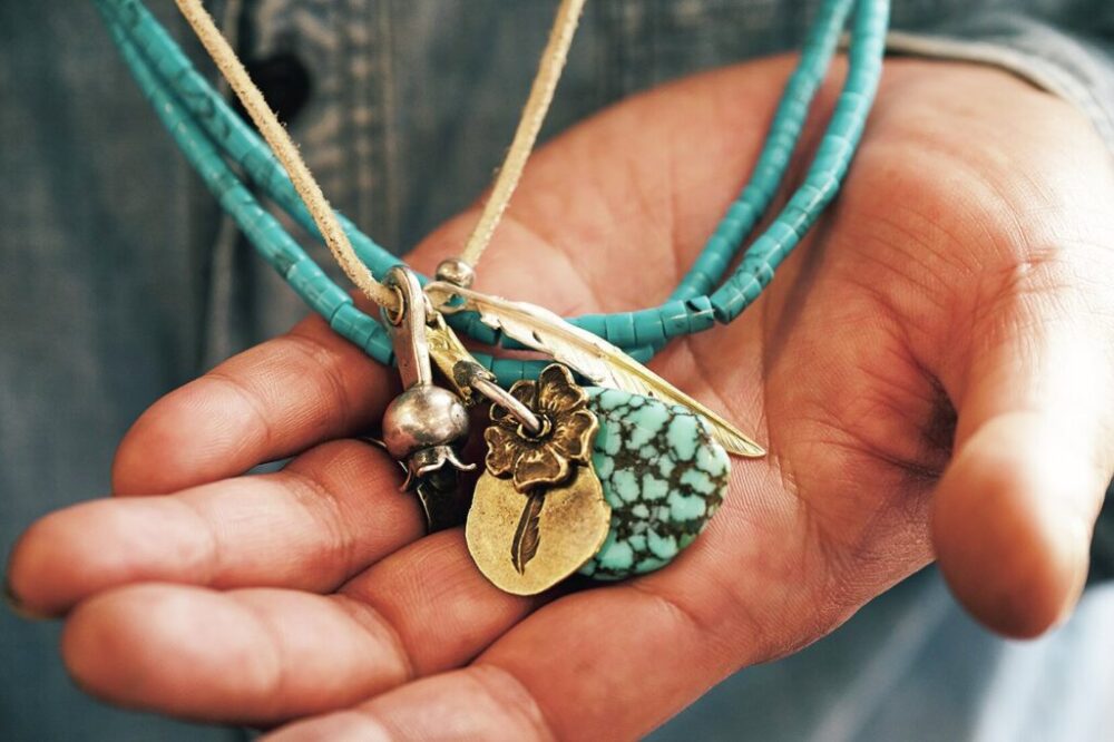 スカッシュブロッサム、風切羽、そしてアメリカ旅の際に出会った美しいNo.8の原石など自分が好きなモチーフを重ね付けしたネックレス。