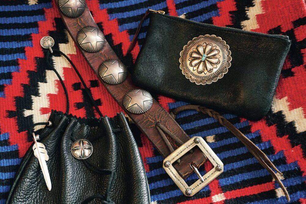 マテリアルにディアスキンを使用したシンプルなウォレットに巾着ポーチ、そしてベルト。いずれも自身が製作したコンチョが付けられ、大きな存在感を放っている。