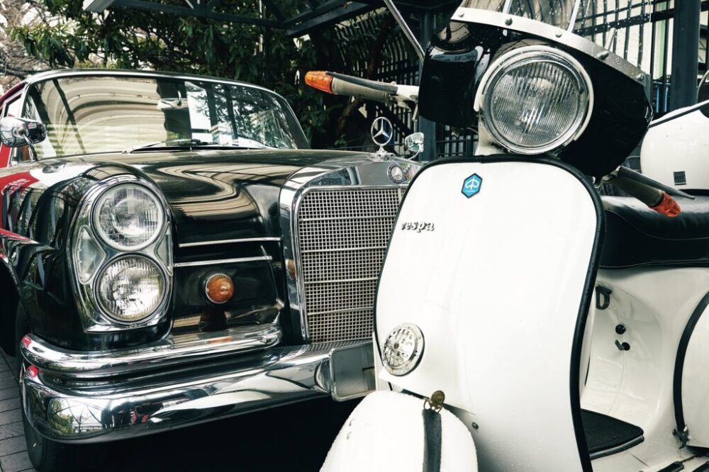 1965年式Mercedes-Benzの220S(W111)と1974年式Vespa Rally200が普段使いとして使用している愛車。そのほかハーレーなども所有している。