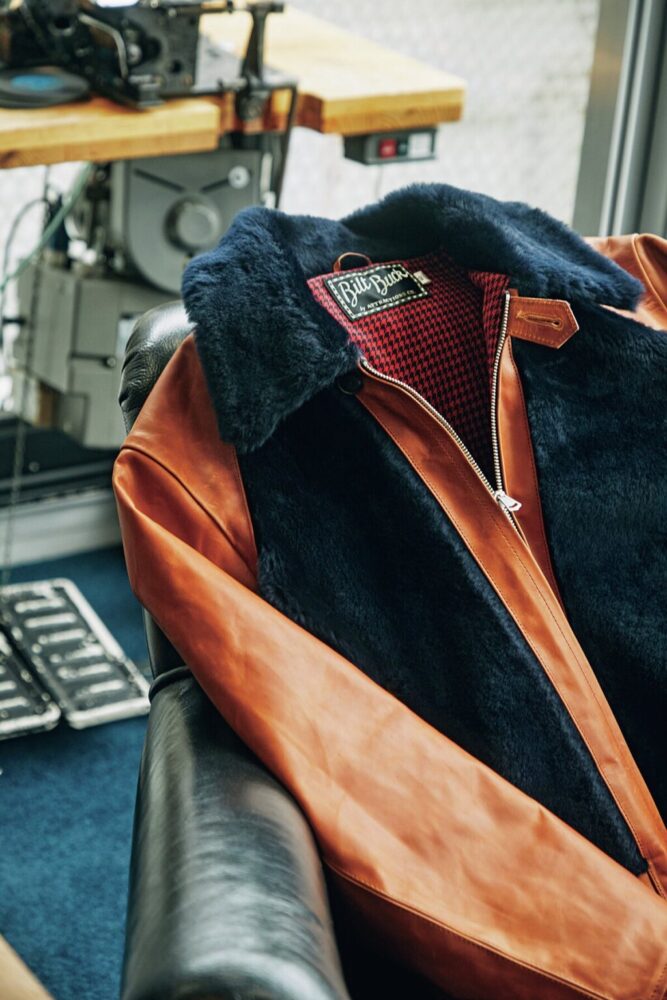 BILTBUCKの代表作でもあるグリズリージャケットの2024モデル。グイディカーフスキンに上質なネイビームートンを採用した。