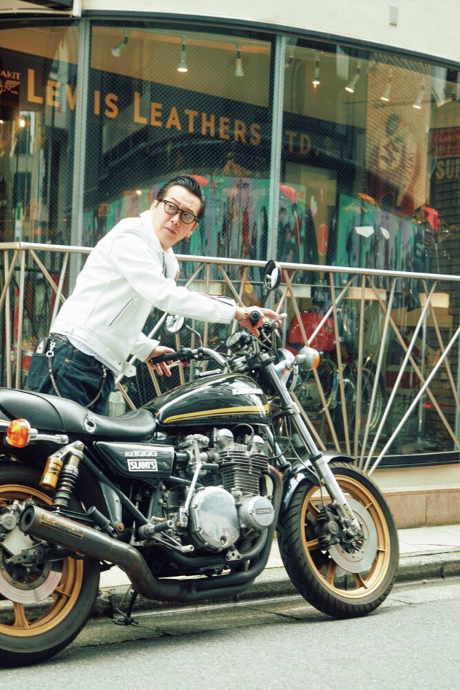 海外でも超がつくほど人気の高い国産旧車、Kawasaki KZ1000が愛車の後藤氏。ホワイトが眩しいシングルのカントリーマンは、最近オーダーから上がったもので、いままでホワイトを敬遠してきた分、ヘビーに着用予定。すでにスタッズカスタムを施しており、ブーツ、ウォレット、ベルトなどと同様、もはやカスタムがデフォルトとなっているのも彼らしい。